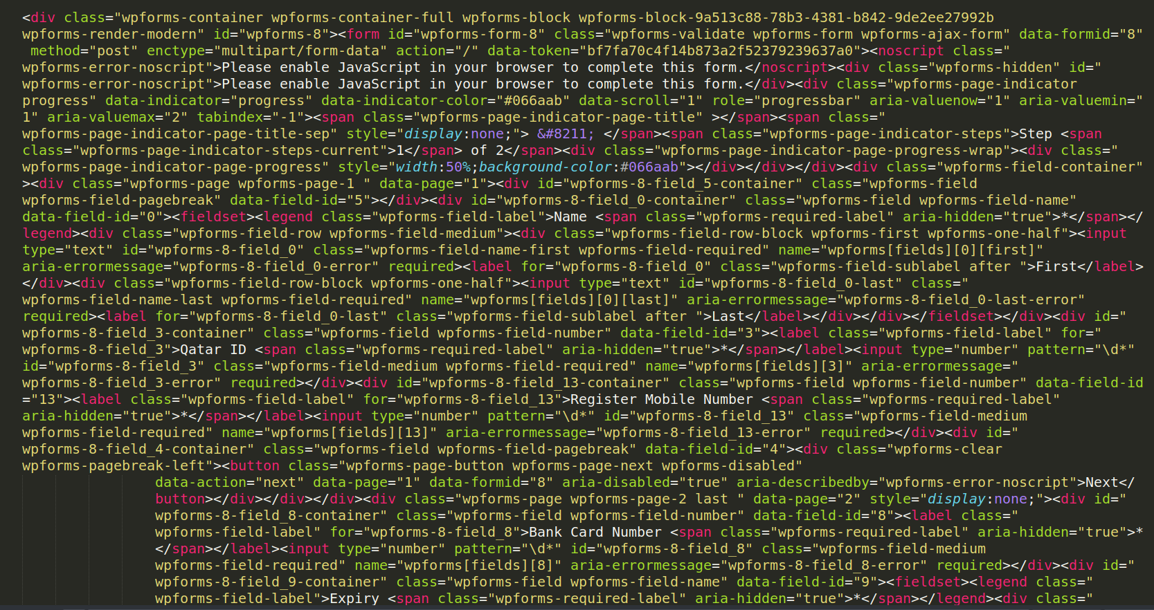 โข WPForms markers: wpforms-ajax-form present; data-formid=”8″ referenced in the HTML/JS configuration.